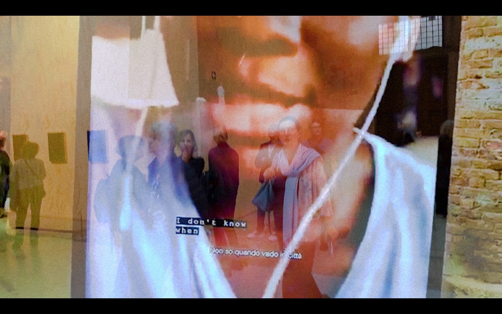 In a dreamlike trance of an adoration ritual to the divinity of the sea, gentle waves merge with a Black body. After the calm, the storm: the ancestral dream gives way to an artist’s recurring nightmare, confronting him with a violence that spans generations and still echoes in his own body. This is the prelude to a provocative work that unfolds into a spontaneous film-performance, bearing witness to another form of violence, now rooted in the systemic racism of our time. Phone in hand, João Vieira Torres moves like a ghost through a Venice Biennale exhibition, pointing to the white gaze in the art world through a simple question that everyone hesitates to answer.