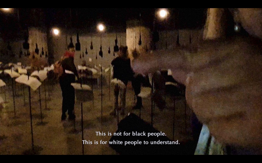 Dans un transe onirique d’un rituel d’adoration à la divinité de la mer, de douces vagues se fusionnent à un corps noir. Après le calme, la tempête : le rêve ancestral cède sa place au cauchemar récurrent de l’artiste, le confrontant à une violence qui traverse les générations et résonne encore dans son propre corps. Voici le prélude d’une œuvre provocante qui se déploie en un film-performance spontané, témoignant d’une autre forme de violence, désormais ancrée dans le racisme systémique de notre époque. Téléphone en main, João Vieira Torres traverse, tel un fantôme, une exposition de la Biennale de Venise, pointant le white gaze dans le monde de l’art à travers une question simple, mais à laquelle tous hésitent à répondre.